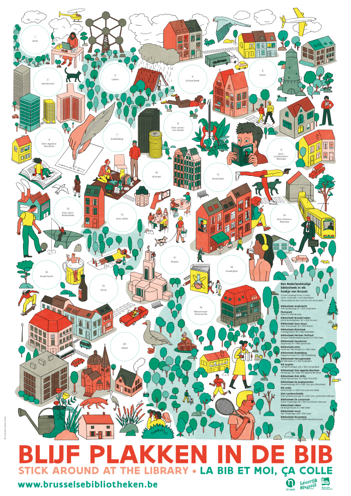Poster for the Muntpunt, the main Dutch-speaking library in Brussels, as a part of a campaign promoting the Dutch-speaking librairies network of Brussels. This poster is made to be filled with stickers, each of them representing one of the 19 municipalities of the Brussels-Capital Region.