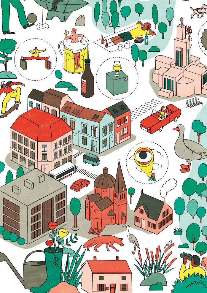 Affiche réalisée pour le Muntpunt, la principale bibliothèque néerlandophone de Bruxelles, dans le cadre d'une campagne de promotion du réseau des bibliothèques néerlandphone à Bruxelles. Cette affiche est à compléter avec différents stickers représentant chacun une des 19 communes de Bruxelles-Capitale.